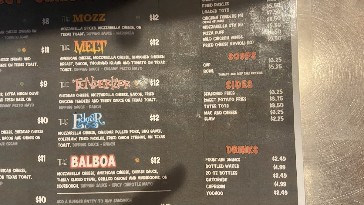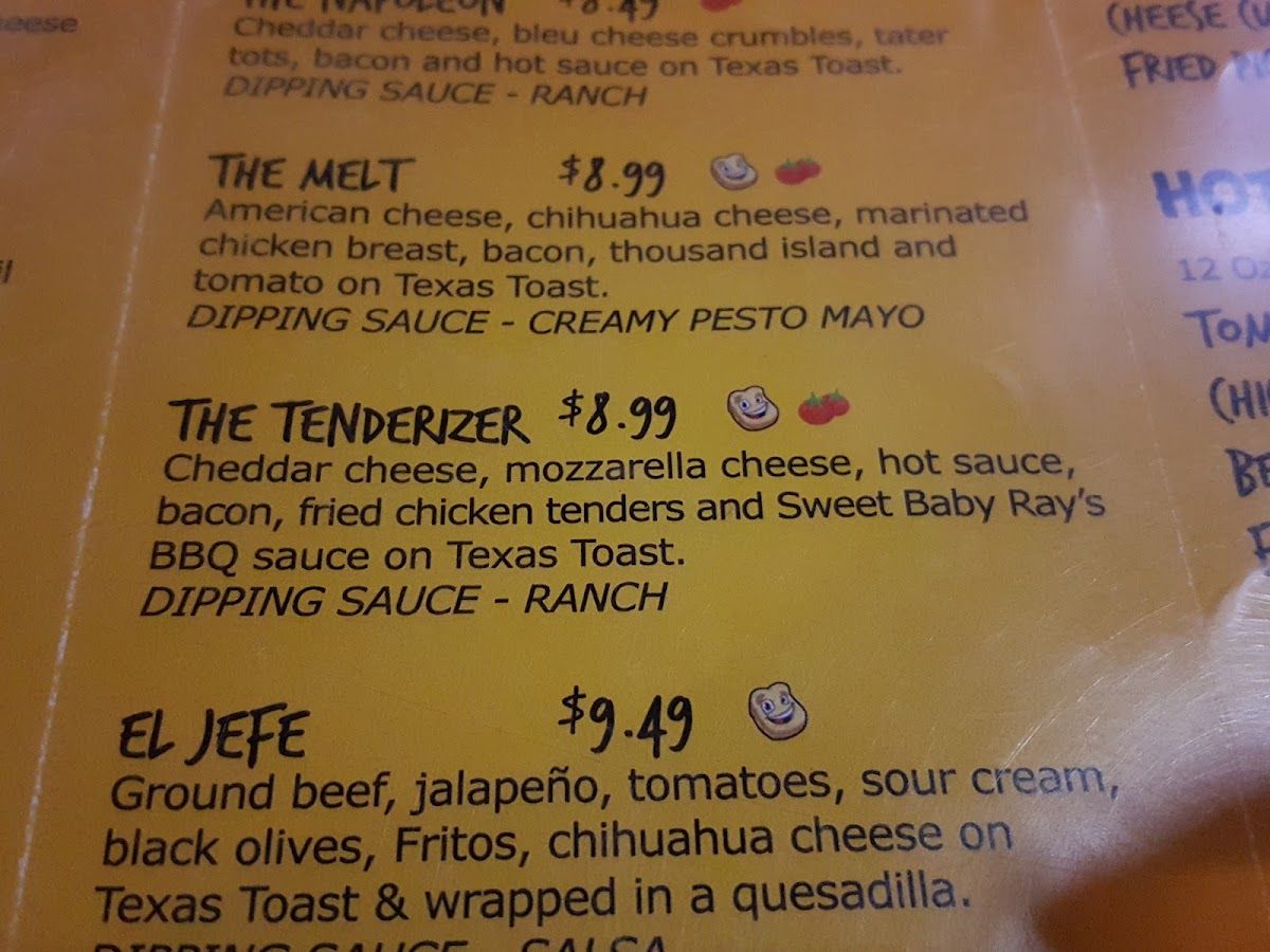 Cheddar cheese, mozzarella cheese, bacon, fried chicken tenders and tendy sauce on Texas toast. Served w/ ranch.