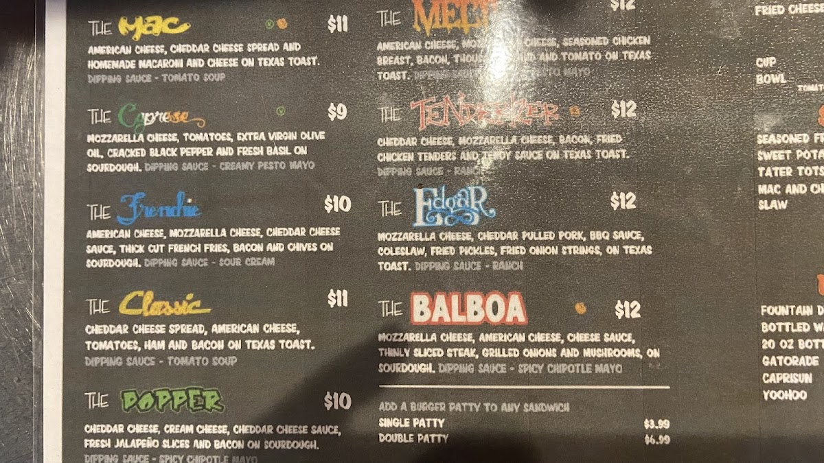 Cheddar cheese, cream cheese, cheddar cheese sauce, fresh jalapeño slices and bacon on sourdough bread. Served w/ chipotle mayo dipping sauce.